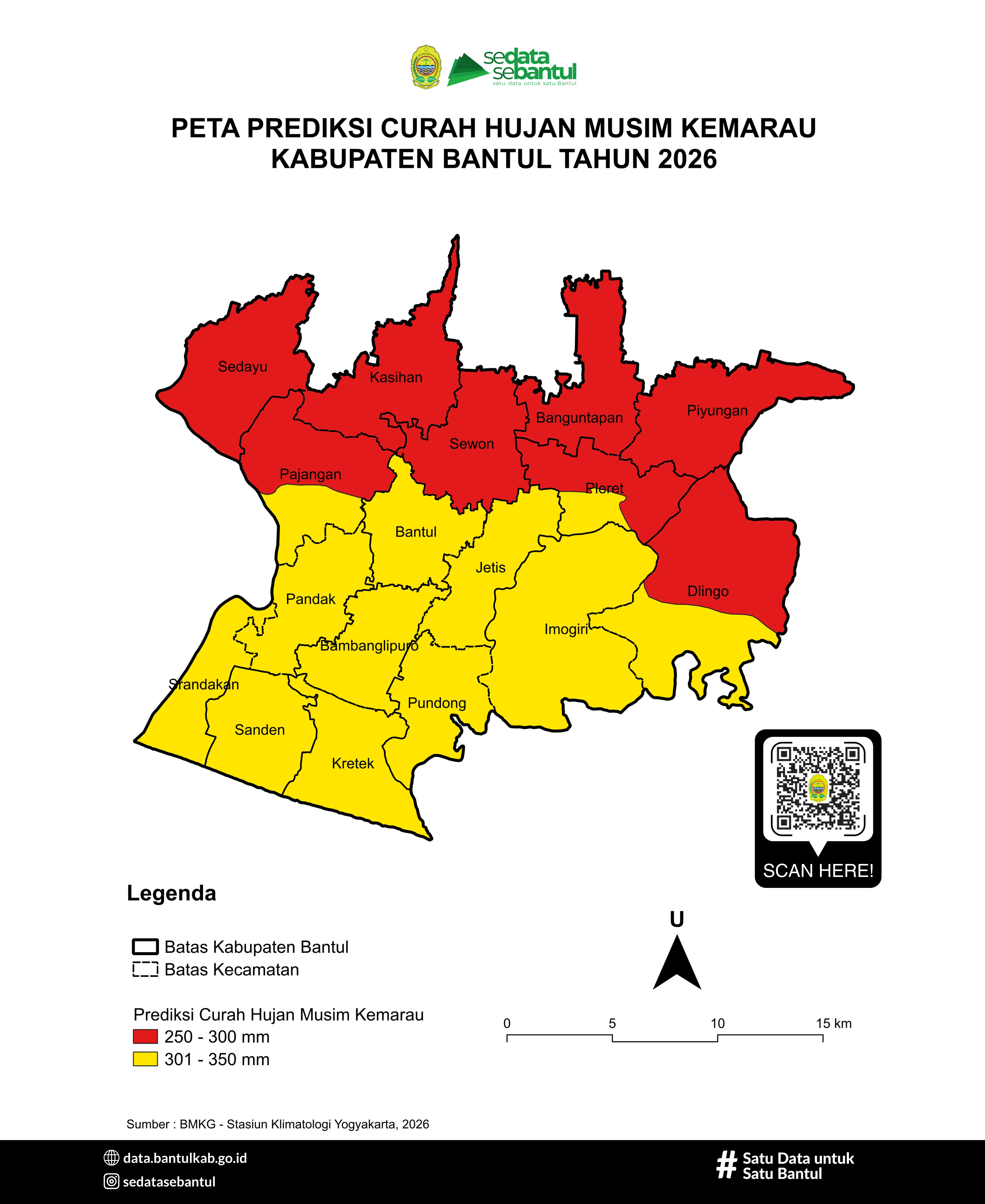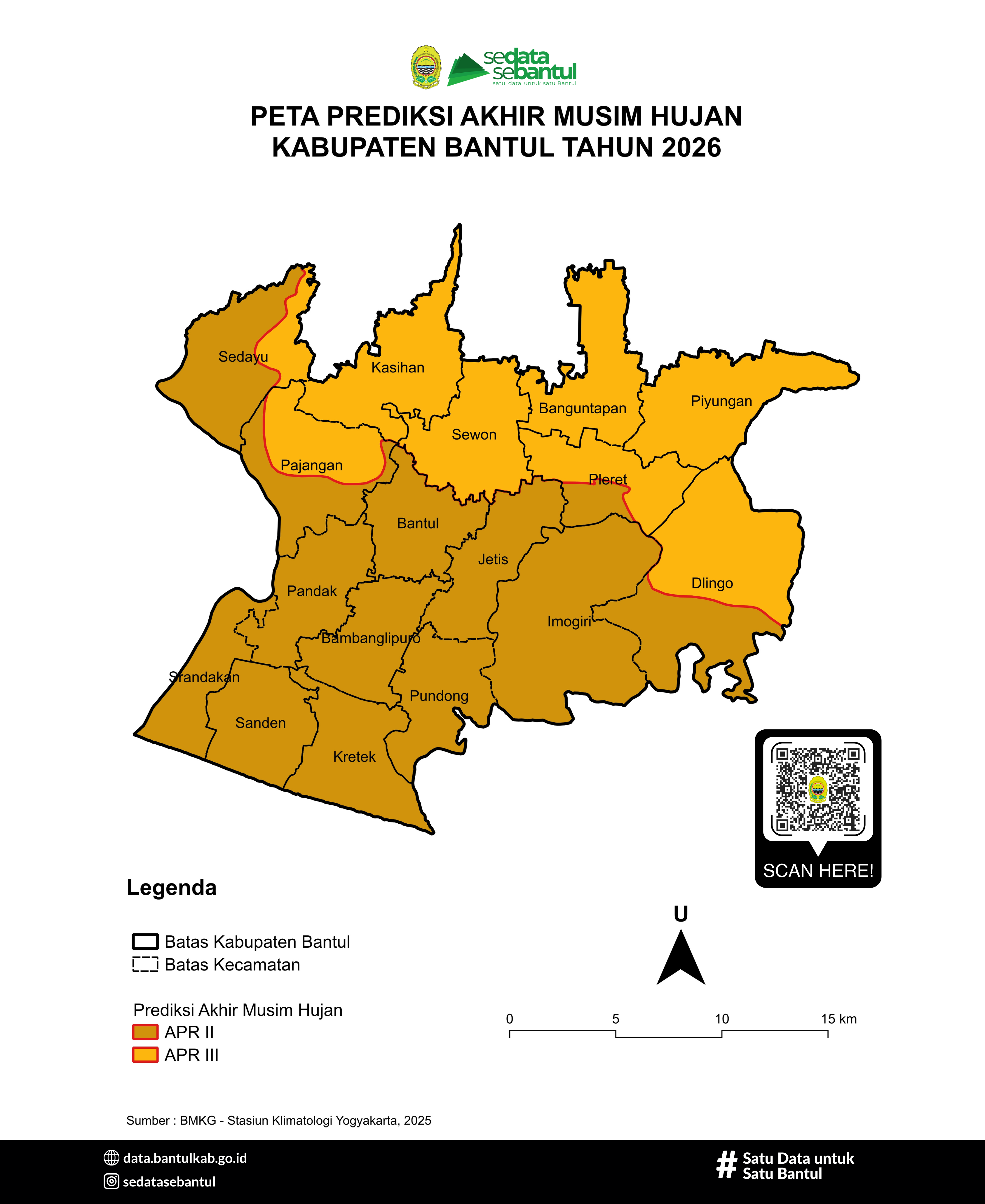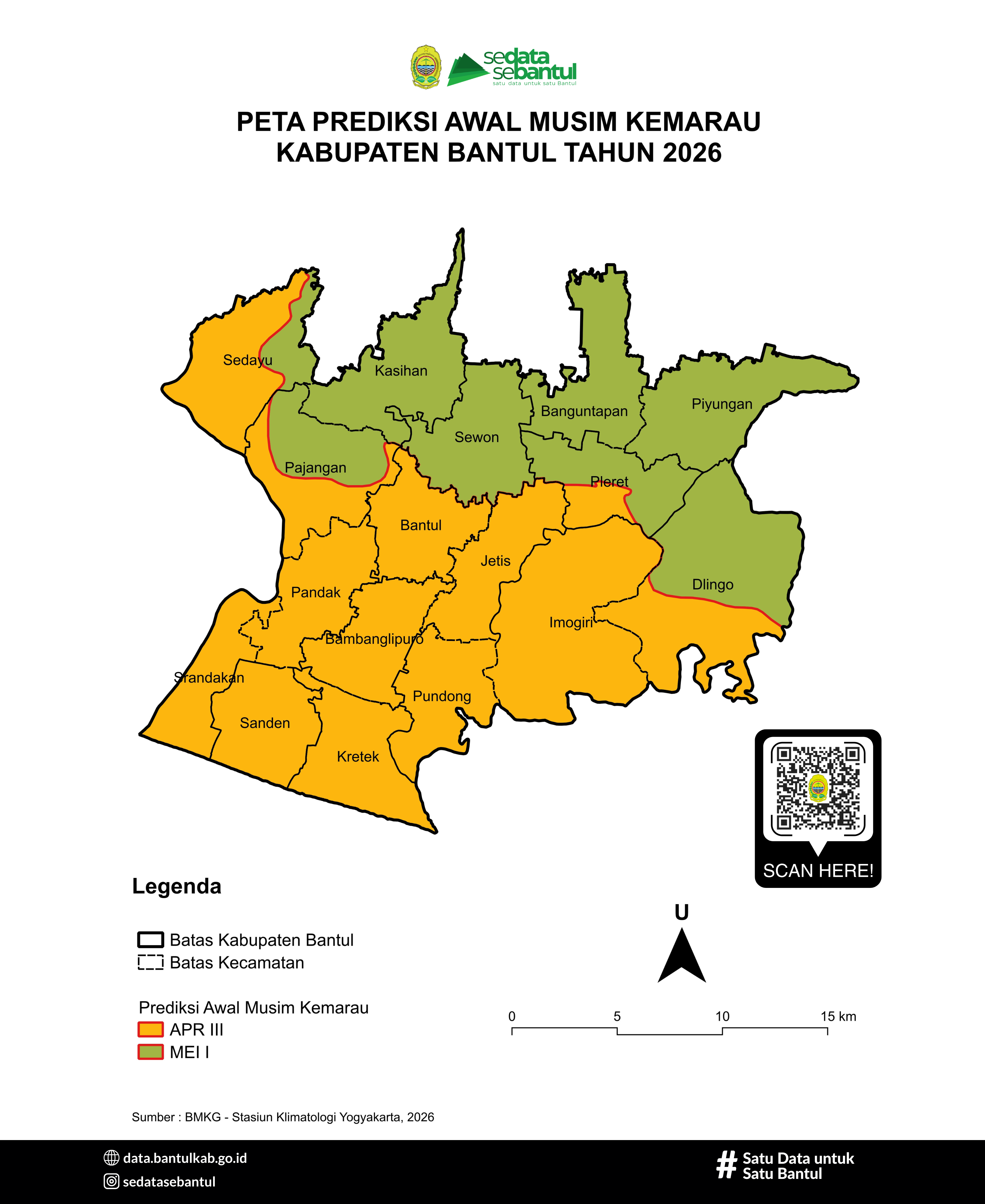 Badan Meteorologi, Klimatologi, dan Geofisika (BMKG) secara berkala merilis publikasi prediksi musim sebagai acuan untuk memahami kondisi musim yang akan datang. Informasi ini disampaikan sebagai referensi dalam mendukung perencanaan dan pengambilan keputusan di berbagai sektor, antara lain pangan, sumber daya air, energi, lingkungan, kehutanan dan kebencanaan serta diharapkan dapat menjadi dasar bagi masyarakat dan pemerintah dalam menyusun strategi adaptif dalam menghadapi musim kemarau. Informasi terkait Prakiraan Musim Hujan 2025/2026 serta Prakiraan Musim Kemarau 2026 telah dirilis oleh Stasiun Klimatologi (Staklim) Yogyakarta melalui laman resmi https://staklim-yogya.bmkg.go.id/. Data tersebut kemudian diolah lebih lanjut untuk menghasilkan informasi prakiraan musim yang spesifik bagi wilayah Kabupaten Bantul.